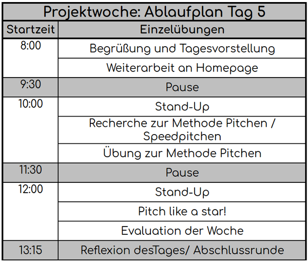 - Im letzten Block des Tages werden dann die Projekte der jeweiligen Gruppen während eines Pitchs der Reihe nach vorgestellt